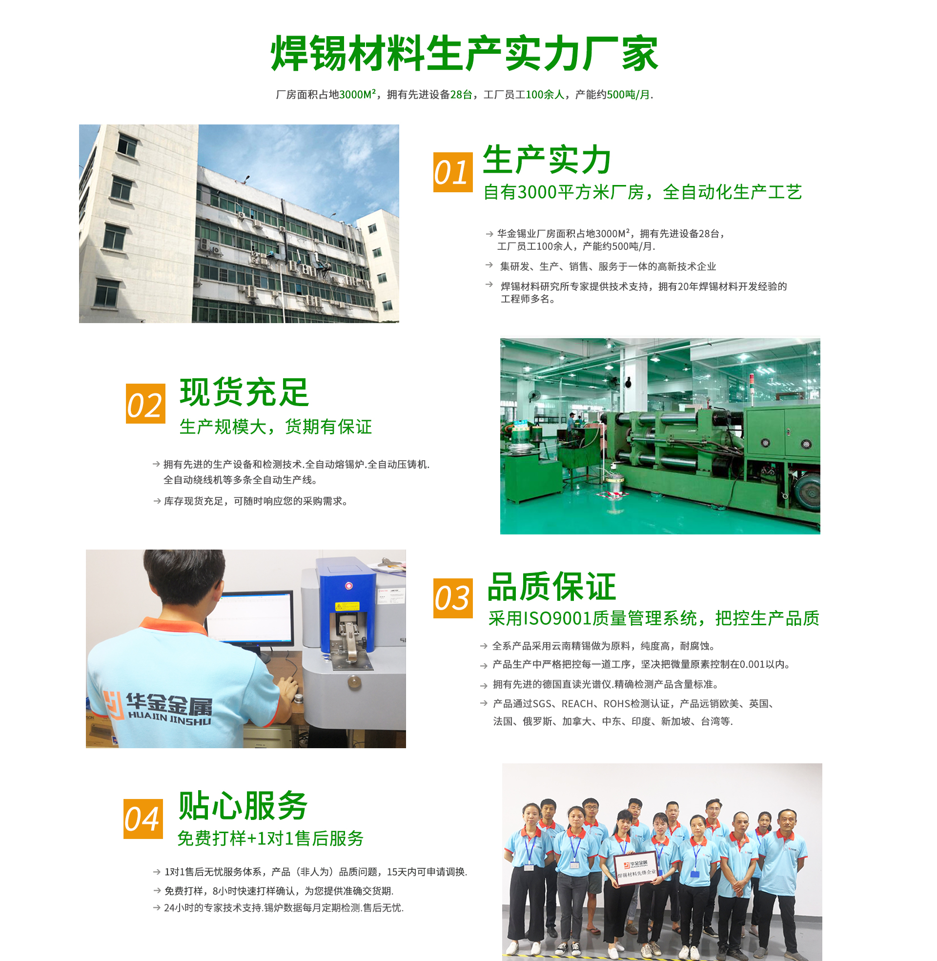 華金錫業有限公司一家資深的專業焊錫制品生產廠家,多年專注焊錫制品生產加工。產品有無鉛錫絲.無鉛錫條.錫板.錫膏.錫珠等.公司憑借多年的經驗和不斷的科技創新.生產的產品各項技術性能均達到國家標準.歐盟標準。并獲得眾多使用廠家的肯定.為適應環保要求.本公司2003年巨資投入生產無鉛焊錫,多年來連續通過SGS環保認證.產品規格齊全,使用性能極佳。客戶群體遍布全國各地及國外用戶。華金錫業焊錫制品是選用一線品牌作為原材料,采用選進的配方,精工制作各種規格不同的型號,再采用全自動流水線作業擠拉成各種符合要求的焊錫絲和焊錫條。華金牌焊錫制品以其一流的品質,真誠的服務,產品銷往全國各地,深受廣大用戶的高度贊揚。